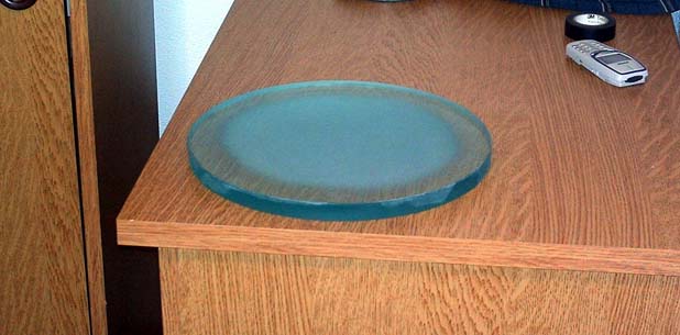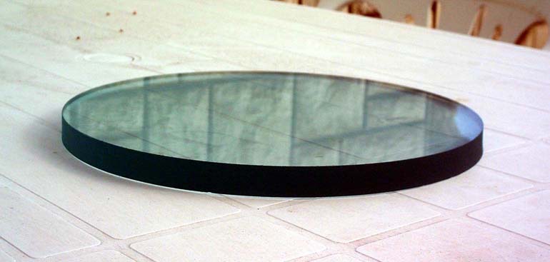 Ovaj 19mm debljine stakleni disk odrezao je Boki, entuzijastični mladi astronom amater. Koristio je čelično krunsko svrdlo postavljeno na stupnu bušilicu. Bušilica se vrti brzinom oko 50 – 60 okretaja u minuti. Rezultat toga je kanal koji se počinje dubsti u staklu. Brusni prah drobi staklo i tako prorezuje disk za zrcalo. Potrebno je oko 3 sata da bi se staklo prorezalo do kraja. Ovo se možda čini sporo, no to je jedino preporučljivo jer rezanje stakla u tvornici košta i 8 – 10 puta više od cijene samog stakla! To je zato što se u tvornici stakla okrugli diskovi režu dijamantnim krunskim svrdlima koja su vrlo skupa pa se preko rezanja naplaćuje njihovo trošenje. Stakleni disk od 300mm košta oko 200kn, ali zbog rezanja sveukupna cijena se penje na 1700kn, što je previše za 300mm 19mm debelo prozorsko staklo. Lijevano 300mm #7740 pyrex staklo debljine 30mm košta oko 600kn što je prihvatljivo. No njega nećete naći u Hrvatskoj.