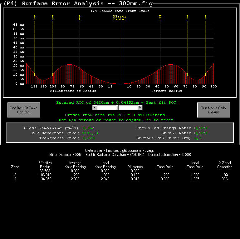Za oko 2 dana uspio sam iskopati udubinu na zrcalu. Nakon završetka kopanja krivulje i izjednačavanja ploha zrcala i alata udubina na zrcalu je bila oko 3.2mm. to daje oko 1710mm žarišne duljine i f-broj od 5.7. Važno je pri mjerenju udubljenja zrcala imati tzv. špijune za ventile. To su mjerni listići, kojih ima 20, a slažu se jedan na drugi po potrebi i zbrajaju da bismo mogli izmjeriti udubljenje zrcala. Dimenzije listića su od 1mm pa sve do 0.05mm. Mjerenje se vrši tako da se položi ravnalo po promjeru zrcala. Mjerni listići se slažu do pretpostavljene vrijednosti udubljenja zrcala i guraju na mjesto gdje je udubljenje najveće. Ako ne mogu ući između ravnala i plohe zrcala, oduzmemo jedan listić i ubacimo tanji. Kada napokon debljina složenih listića odgovara udubljenju zrcala, počnemo umetnute listiće zbrajati, a dobiveni rezultat je udubljenje zrcala.