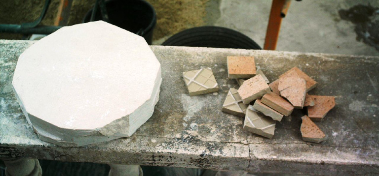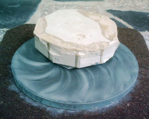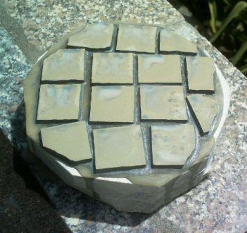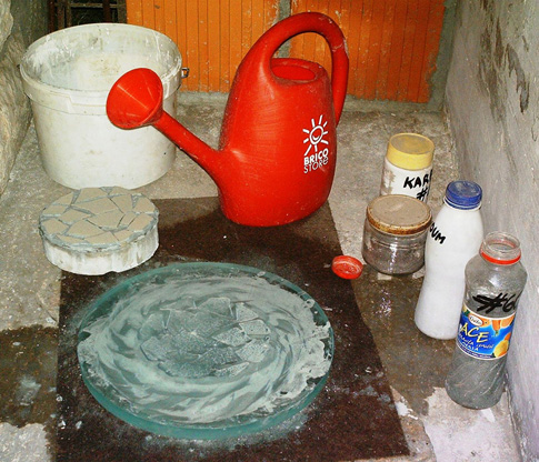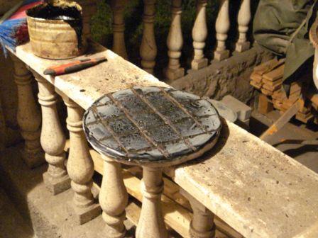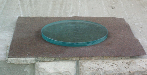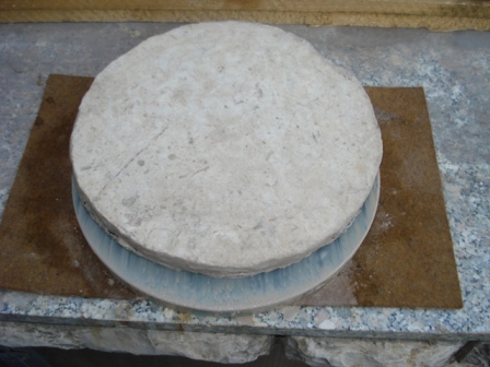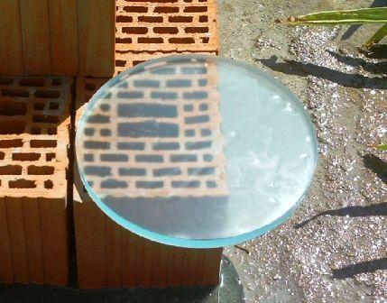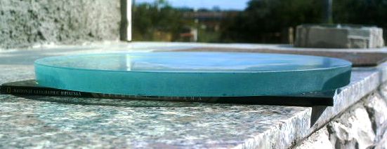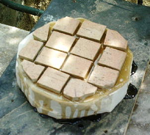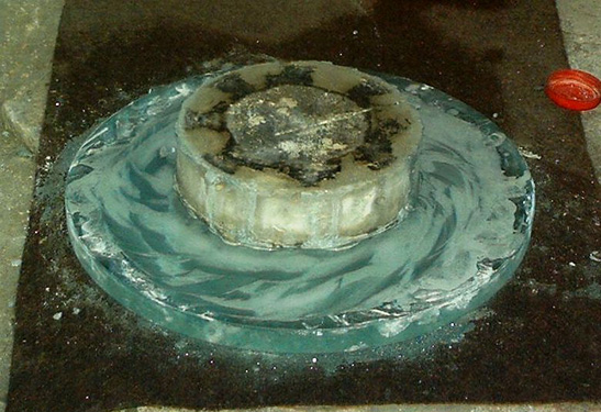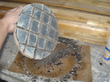 Dan nakon početka brušenja odlučio sam načiniti novi alat koji će imati tešku mramornu ploču 200mm promjera kao podlogu. Kupio sam epoksidnu smolu za plastične brodove i njome nalijepio porculanske pločice. Mramorna ploča mora biti vrlo teška radi bržeg kopanja udubine u staklu i tako sam napravio novi alat za brušenje. Na otpadu rezanih mramornih blokova sam nabavio komad mramora debljine 50mm i izrezao ga u krug brusilicom s reznom pločom za kamen i beton.