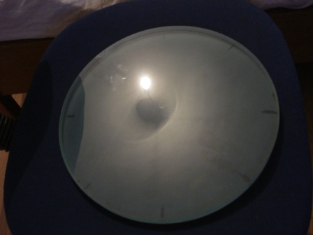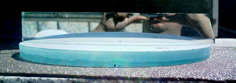 U petak 11.08.2006. počeo sam brusiti ovo zrcalo. Za ovako tanko zrcalo najbitnije je kvalitetno pripremiti podlogu za zrcalo. Ja sam u tu svrhu koristio mramornu ploču i na nju postavljen tepih. Ovakva podloga omogućava ravnomjerno oslanjanje stakla čime se izbjegava savijanje stakla tokom brušenja. Morate biti vrlo pažljivi pri izradi velikih tankih zrcala jer se savijaju poput papira! Diskovi izrezani iz ovakvih staklenih tabli imaju solidno ravne obje strane tako da nema potrebe za poravnavanjem naličja zrcala.