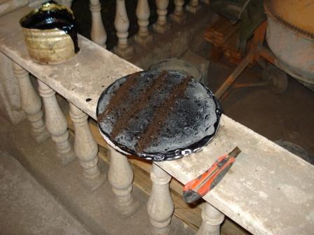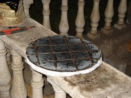 Nakon duže stanke nastavio sam s izradom ovog zrcala pa sam tako 14.04.2008. krenuo na poliranje. Na već otprije nabavljenu 300 milimetarsku mramornu ploču debljine 20mm izlio sam smolu za poliranje. Nisam ni slutio da će za izradu matrice za poliranje trebati izliti svu smolu koju sam imao. Evo par fotografija izrade matrice za poliranje.